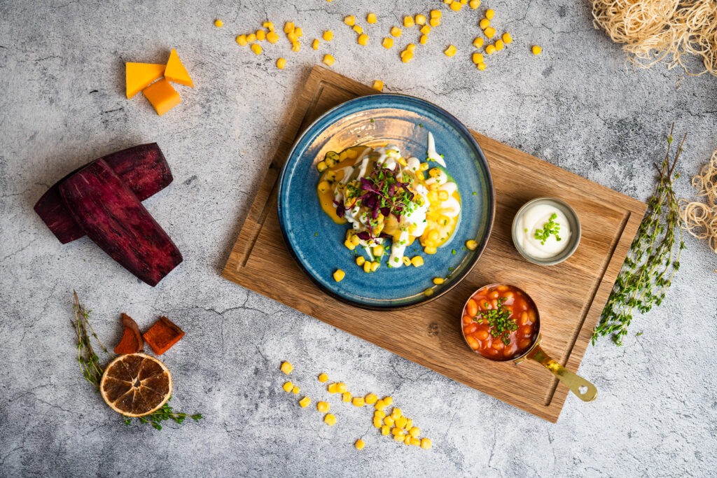 Salt-crusted potato baked in its skin, topped with Cornish Cheddar, sour cream, baked beans, corn and chives Add bacon: £ 2.00